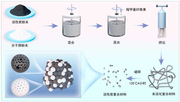 活性炭之所以特別適合用于吸附過程,是因?yàn)樗哂懈叨榷嗫椎臒o定形結(jié)構(gòu),能夠吸附各種分子。它具有微孔和中孔,可以容納各種大小的分子,補(bǔ)充了分子篩的孔隙特異性。活性炭還具有利用功能基團(tuán)改變其表面化學(xué)性質(zhì)的潛力,從而增強(qiáng)其與目標(biāo)分子的相互作用。本文以羧甲基纖維素為黏合劑,通過機(jī)械混合和擠出法制備了一系列 華活性炭分子篩復(fù)合材料(圖1)。